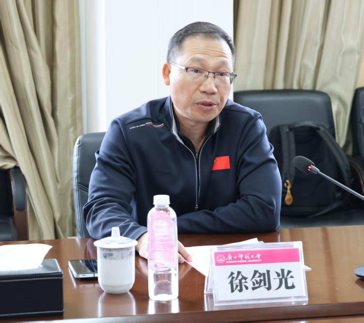 徐剑光先生高度肯定了学校在教师教育、科技兴桂和社会服务等方面取得的成效。回顾了李宁先生与母校的深厚情谊,介绍了李宁集团“四总部两基地”的核心战略布局。他表示,此次战略合作是深化广西基地布局、强化区域研发能力的关键举措。双方就共建实训基地、协同产品研发、创新人才培养、助力竞技体育发展四大维度达成合作共识。