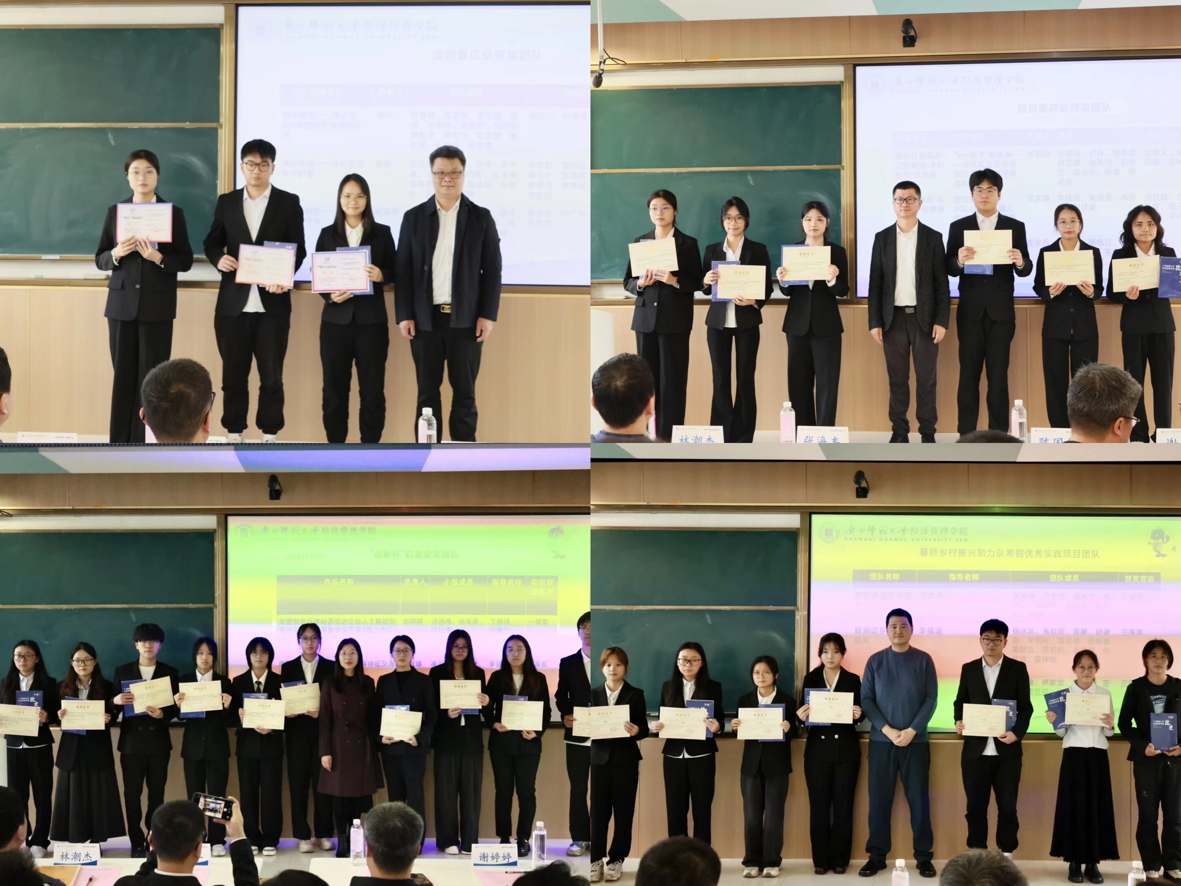 在表彰环节,学院党政主要负责人、分管学生工作负责人、优秀院友代表分别为2026年暮桥乡村振兴助力队寒假社会实践团队、2025年“创新杯”院赛获奖团队、2025年国创赛院赛及区赛获奖团队颁奖。现场掌声阵阵,既是对获奖学子实践成果的肯定,也为全体同学树立了优秀榜样,营造了比学赶超的良好氛围。