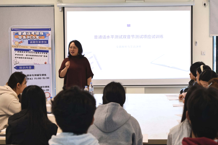 本次系列沙龙紧扣普通话测试核心考点,分为双音节与朗读、单音节与命题说话两个专题,分别邀请国际文化教育学院副教授刘惠老师、文化部考级委员会朗诵考级高级指导教师王琳老师主讲。刘惠老师结合自身丰富指导经验,重点围绕发音技巧、声调搭配、音变规律及朗诵备考等核心内容,通过示范领读、逐字纠错等方式,帮助学子拆解发音误区、掌握科学备考方法;王琳老师则聚焦发音矫正、易混淆音节辨析,通过现场带读、精准点拨,同步讲解命题说话的思路构建与表达技巧,结合考级评分标准拆解应试要点,为学子提供一对一答疑指导。