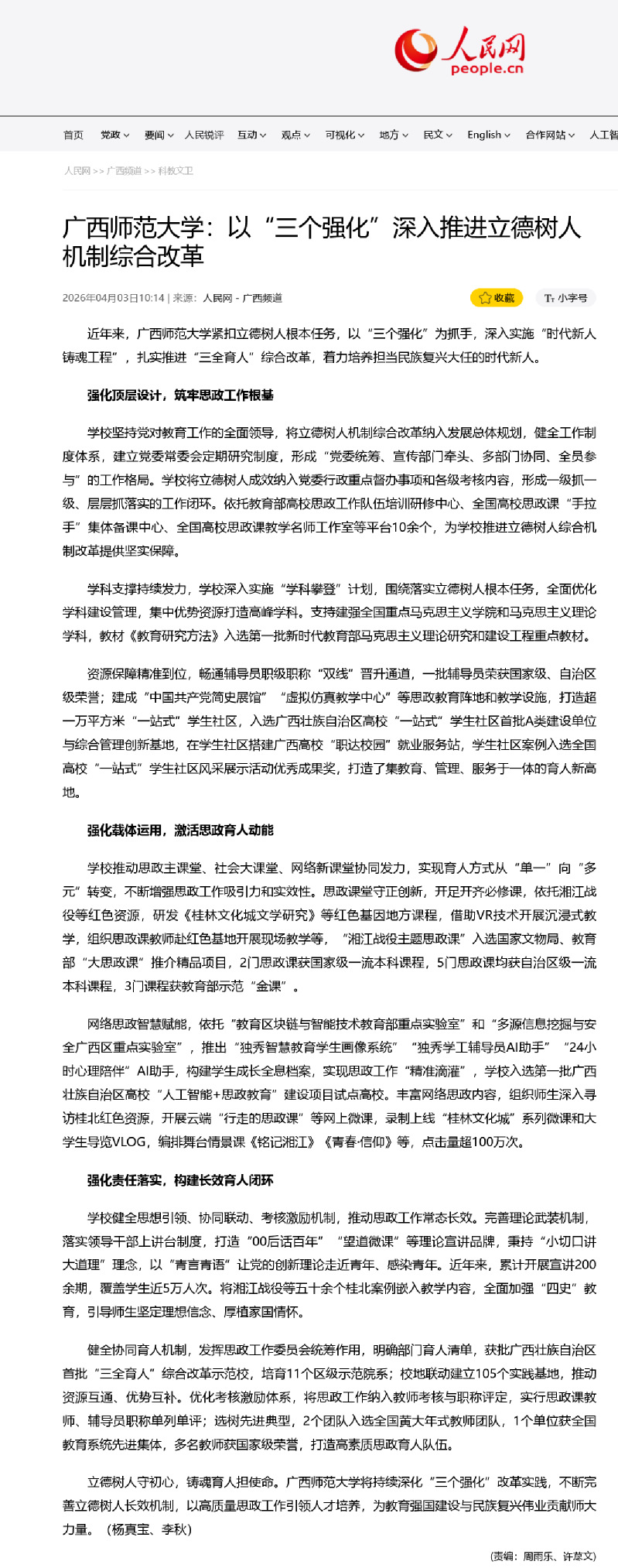 4月3日,人民网刊发题为《广西师范大学:以“三个强化”深入推进立德树人机制综合改革》的报道,全面聚焦我校紧扣立德树人根本任务,以“三个强化”为抓手,深入实施“时代新人铸魂工程”,扎实推进“三全育人”综合改革,着力培养担当民族复兴大任的时代新人。