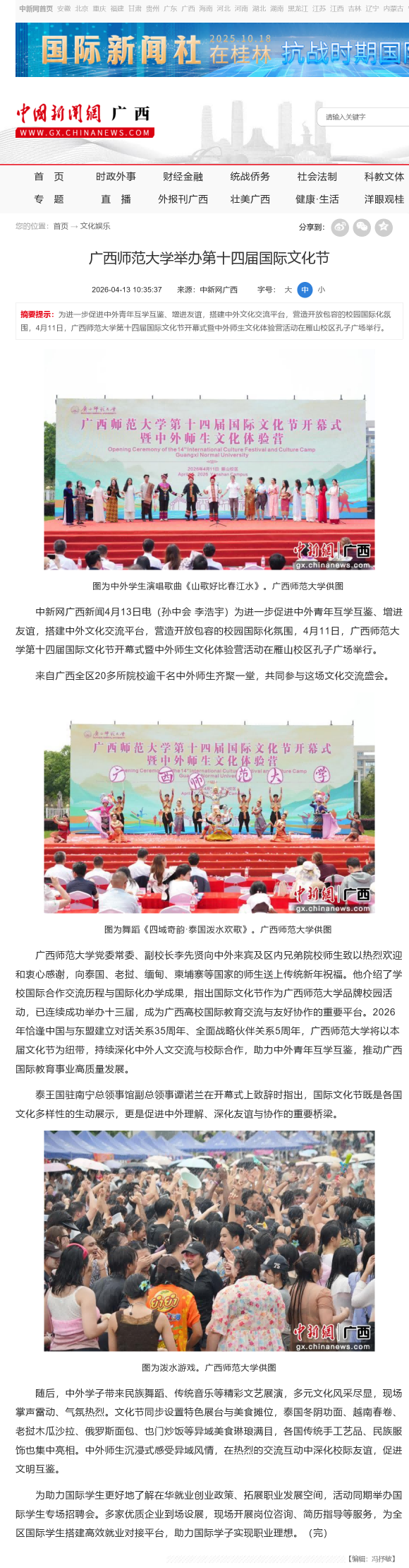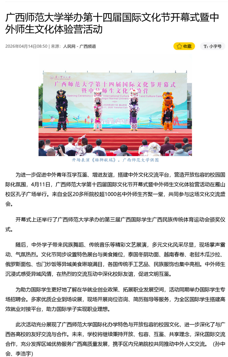 4月13日,【人民网】【中新网】分别聚焦我校4月11日在雁山校区孔子广场举行的第十四届国际文化节开幕式暨中外师生文化体验营活动,关注搭建起中外文化交流、青年互学互鉴的重要平台。