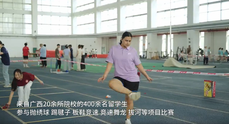 绣球划出一道道弧线精准入篓,学生三人一板喊着口号冲向终点,舞龙队伍在赛场上腾跃穿梭……近日,第三届广西国际学生广西民族传统体育运动会在广西师范大学举办,来自广西20余所院校的400余名国际学生参与抛绣球、踢毽子、板鞋竞速、竞速舞龙、拔河等项目比赛。