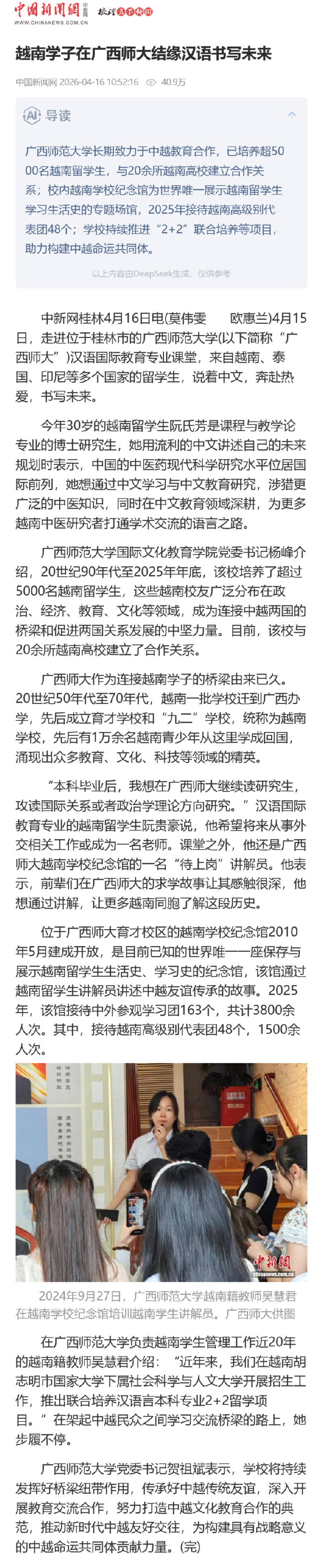 4月16日,【中国新闻网】刊发题为《越南学子在广西师大结缘汉语书写未来》的报道,聚焦我校国际教育交流与中越人文合作成果,生动展现越南留学生在我校深耕学业、追逐梦想的青春风采。