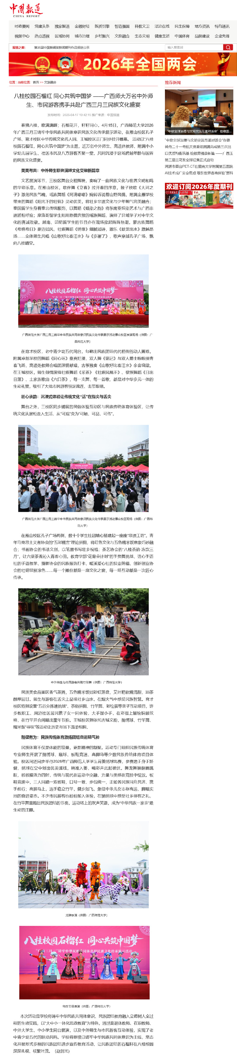 4月17日,【中国报道】刊发题为《八桂校园石榴红 同心共筑中国梦——广西师大万名中外师生、市民游客携手共赴广西三月三民族文化盛宴》的报道,聚焦我校4月15日在雁山、育才、王城三校区同步举办的“广西三月三”铸牢中华民族共同体意识民族文化传承展示活动。本次活动有近万名中外师生、离退休教师、附属学校学生、市民及游客欢聚一堂,以老中青少幼五代同台、中外师生共演、校地市民互动的形式,将民族团结教育与立德树人深度融合,成为我校推进中华民族共同体意识教育的鲜活实践。