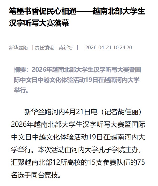 近日,【人民网】【新华社】关注报道于19日在越南河内大学举行的2026年越南北部大学生汉字听写大赛暨国际中文日中越文化体验活动。越南河内大学孔子学院是河内大学和广西师范大学共同建设的孔子学院,本次汉字听写大赛首次使用“AI+汉字听写”平台(东盟版)进行比赛,活动在热烈氛围中圆满落幕。