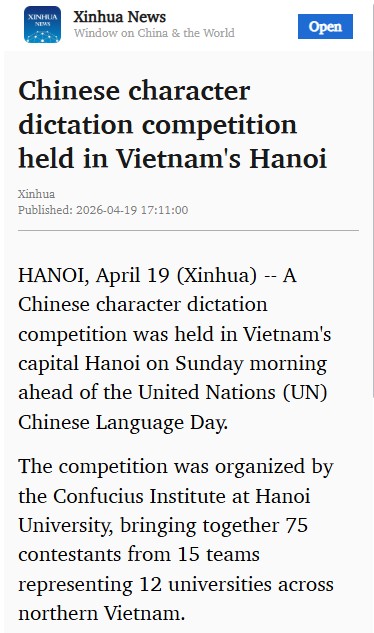 HANOI, April 19 (Xinhua) -- A Chinesecharacter dictation competition was held in Vietnam's capital Hanoi on Sundaymorning ahead of the United Nations (UN) Chinese Language Day.
