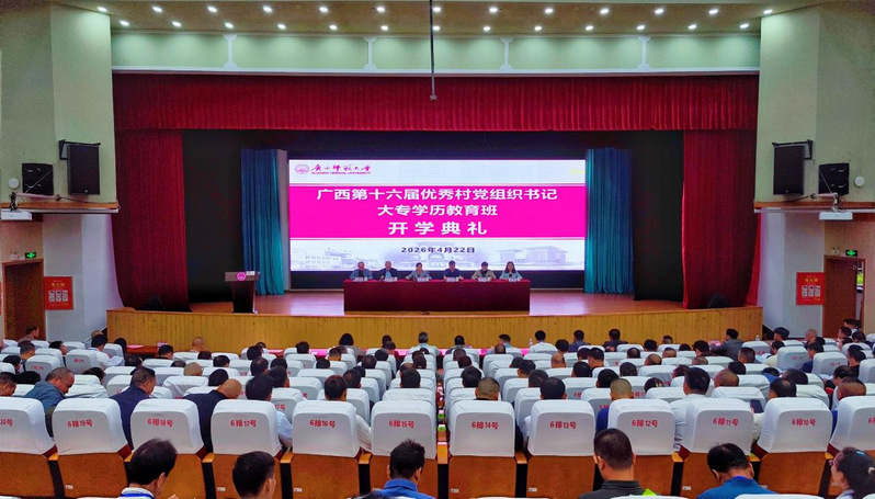 4月22日上午,广西第十六届优秀村党组织书记大专学历教育班开学典礼在我校育才校区举行。校党委常委、副校长沈星灿,自治区党委组织部组织三处处长於志宏出席典礼并讲话,继续教育学院相关负责人及300名学员参加活动。