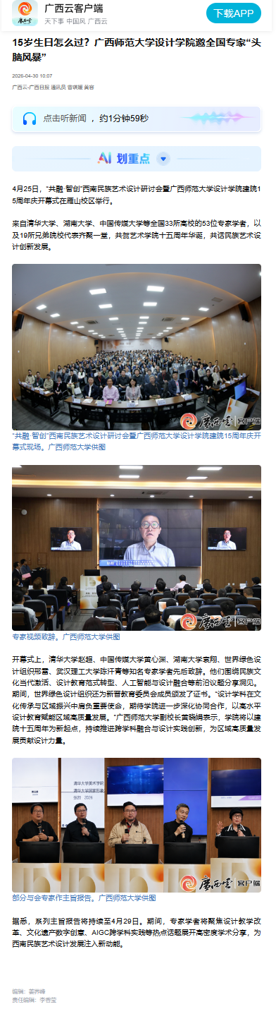 4月30日,【广西日报】刊发题为《15 岁生日怎么过?广西师范大学设计学院邀全国专家 “头脑风暴”》的报道,聚焦4月25日我校在雁山校区举办的“共融・智创”西南民族艺术设计研讨会暨设计学院建院15周年庆开幕式。活动期间,世界绿色设计组织为新晋教育委员会成员颁发证书,系列主旨报告持续开展,为西南民族艺术设计高质量发展注入新动能。我校设计学院将以建院15周年为新起点,持续推进跨学科融合与设计实践创新,以高水平设计教育赋能区域高质量发展。