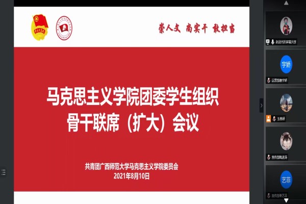 为健全党委全面领导、团委具体指导的青年学生组织体系,进一步深化共青团改革,提升学院团委的组织力、引领力、服务力,8月10日晚,马克思主义学院团委学生组织骨干联席(扩大)会议在线上召开。学院团委书记及全体学生骨干参加本次会议。