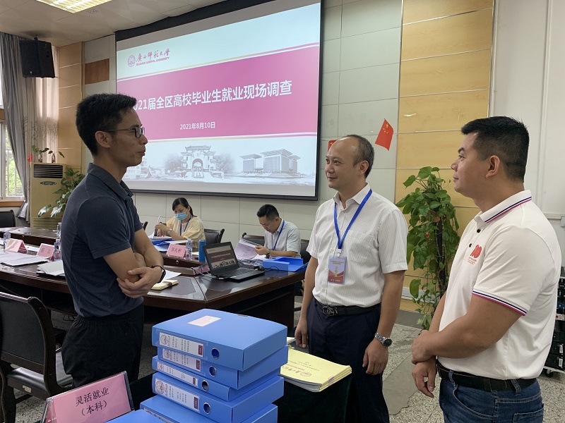 调查组工作人员现场开启调查数据密封袋,根据广西毕业生就业创业指导中心指定调查数据、广西高校2021届毕业生就业状况网络调查反馈数据,逐份核查就业证明材料有效性和规范性、就业数据真实性和精准性。同时,调查组还通过翻阅现场材料,重点核查我校灵活就业情况、农村家庭经济困难高校毕业生就业情况、2021届毕业生就业工作相关台账。随后,调查组与我校相关职能部门分管工作负责人围绕2021届高校毕业生就业工作进展情况、面临的形势、典型经验做法、存在的问题及对策进行深入地了解交谈。