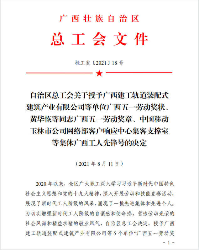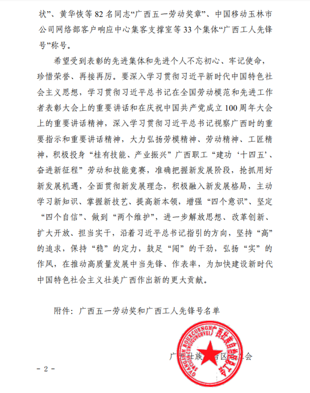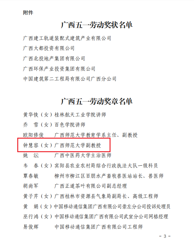 近日,自治区总工会印发《关于授予广西建工轨道装配式建筑产业有限公司等单位广西五一劳动奖状、黄华恢等同志广西五一劳动奖章、中国移动玉林市公司网络部客户响应中心集客支撑室等集体广西工人先锋号的决定》(桂工发〔2021〕18 号),我校马克思主义学院钟慧容老师荣获广西五一劳动奖章。
