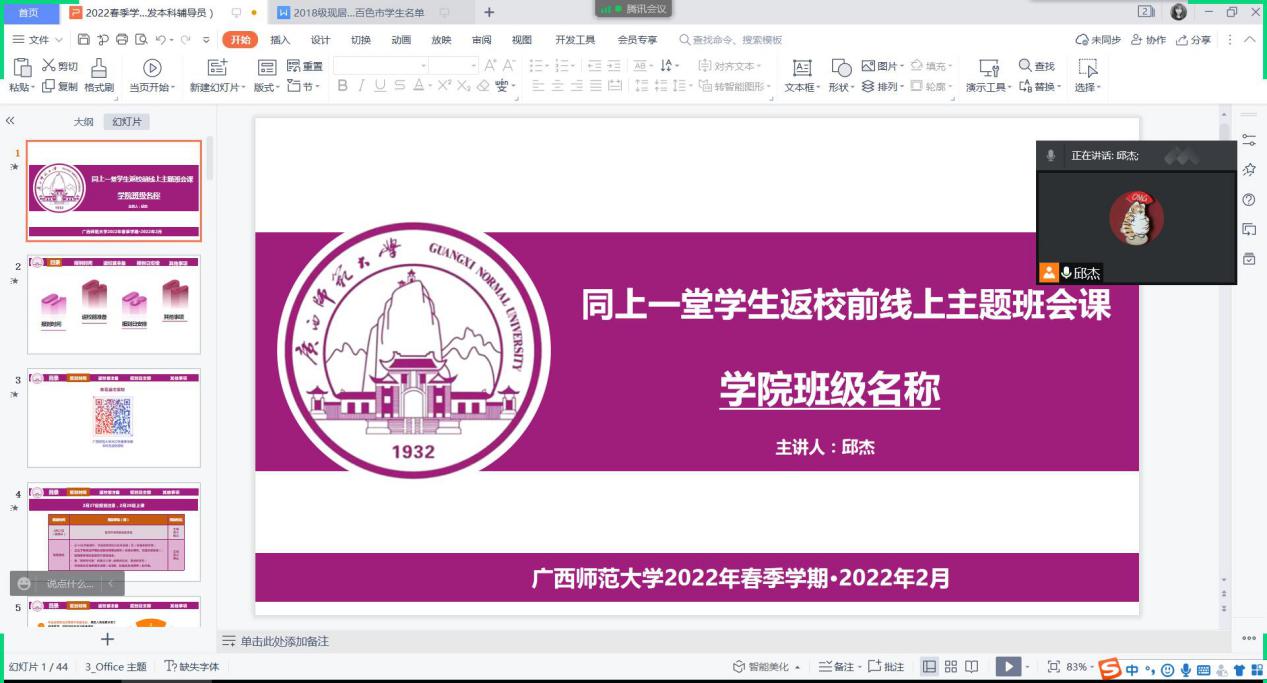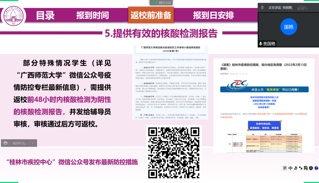 课上辅导员强调,疫情尚未结束,防控不能松懈。学生返校必需遵从桂林市相关防疫要求,做好返程规划并按要求线上提交返校申请,预先准备好个人健康码、行程码等材料,部分学生还需提交有效核酸报告。要求同学们开学前14天一定要做好健康监测。