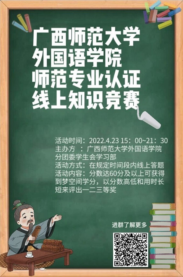 师范类专业认证是我国高等教育质量保障体系的重要组成部分,我院于今年参加教育部师范专业认证,为推动学院学生对相关政策和知识的了解与学习,落实新时代国家和地方教育教学改革任务,促进学生专业能力的提高,4月23日,外国语学院(以下简称“外院”)在线上举办外国语学院师范专业认证知识线上竞赛。