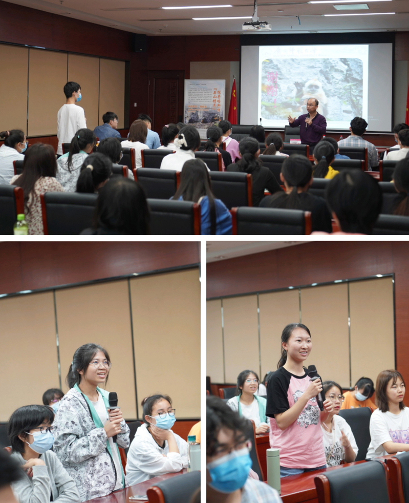 周老师首先从全球最濒危的灵长类动物之一,我国特有种,国家一级保护野生动物——白头叶猴说起,详细介绍了白头叶猴的种群分布、生活环境及其现状与前景,指出生物多样性保护对人类社会发展的重要性,强调人类必须重视物种及其栖息地生态的保护。接着,周老师从国家层面,介绍了全国人大常委会通过立法全面禁食野生动物,然后结合自己20余年保护白头叶猴的科研实践及生态保护工作经验,呼吁新一代青年要关爱大自然,增强保护生物多样性、保护生态环境的担当与责任意识,为人类的生态文明建设积极贡献力量。在随后的互动交流环节,同学们纷纷踊跃提问,与嘉宾老师进行了热烈互动。