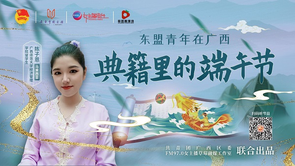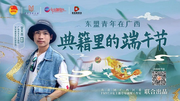 近日,我校留学生陈子恩和堂天霖受邀参加团区委联合南宁市图书馆、广西广播电视台组织策划的“东盟青年在广西:典籍里的端午节”主题活动。活动通过录音和视频连线的创新形式,与东盟青年共同讲述承载着2000多年华夏文化记忆的端午节。来自马来西亚的陈子恩和老挝的堂天霖分别朗诵了《穆天子传》和《续齐谐记》两本典籍中与端午节相关的记载,并与听众分享了自己家乡过端午节的习俗。