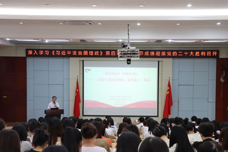 9月23日,自治区人民政府参事黄健教授应邀作题为“开辟新境界 实现新飞跃——《习近平谈治国理政》(第四卷)解读”的专题辅导报告。本次报告会由政治与公共管理学院行政负责人主持,学院领导班子成员、党支部书记、专兼职辅导员、全体在校党员以及入党积极分子共250多人参加报告会。