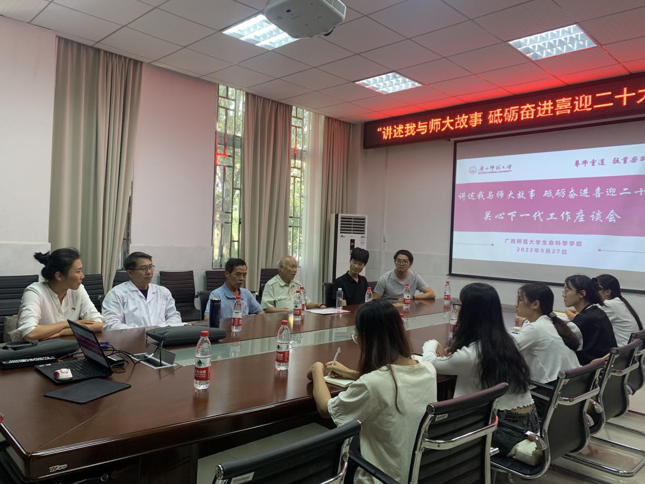 9月27日,生命科学学院在伯康楼108会议室举办“讲诉我与师大故事,砥砺奋进喜迎二十大”关心下一代工作座谈会。会议特邀学院离退休老教师唐兆睦、周善义出席,学院党委负责人携行青年教师代表、行政教辅工作人员、学生代表共30余人参加座谈会。