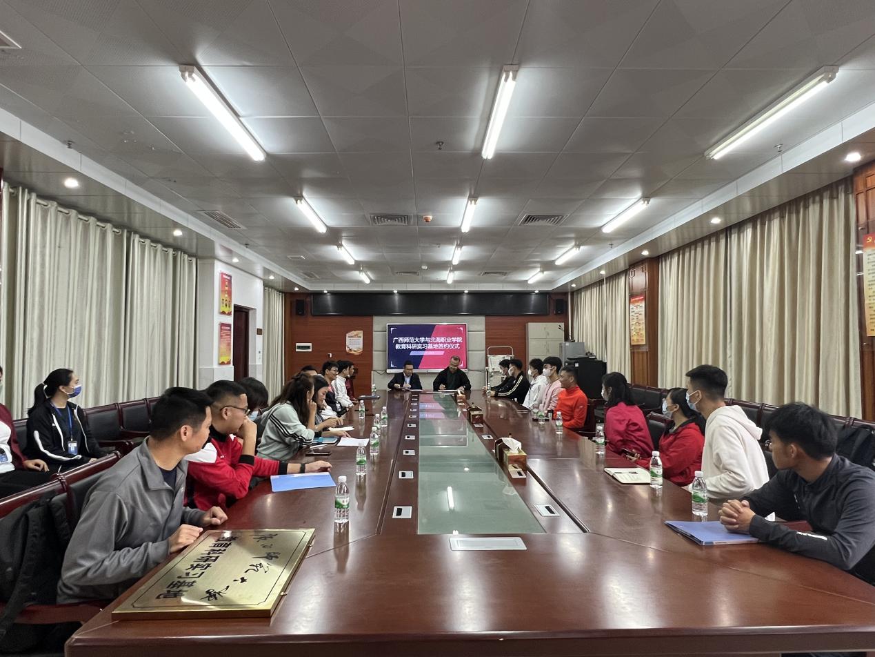 学院分管教学工作负责人也对北海职业学院高度重视双方合作关系表示感谢,在座谈中高度评价北海职业学院的办学模式和体育育人成果,他表示期待双方进一步交流合作,为北海职业学院体育育人工作向前发展搭建交流平台,让体育运动成为学校高素质技术人才培养的重要途径。座谈最后,双方达成合作意向,学院分管教学工作负责人与刘振华副院长签署“广西师范大学教育科研实习基地”合作协议并授予牌匾。