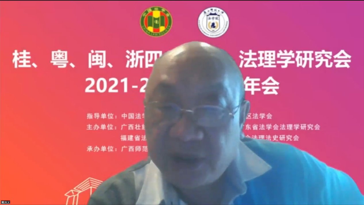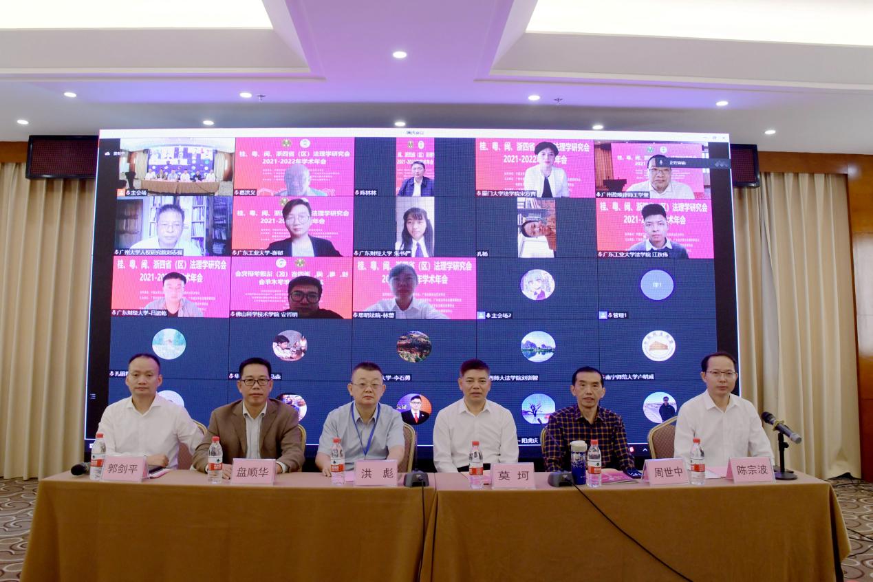 11月12日,由广西壮族自治区法学会法理学研究会、广东省法学会法理学研究会、福建省法学会法理学研究会、浙江省法学会法理法史研究会主办,广西师范大学法学院、广西地方法治与地方治理研究中心承办的“桂、粤、闽、浙四省(区)法理学研究会2021-2022年学术年会”在桂林举行。广西壮族自治区法学会党组成员、副会长洪彪,广东省法学会副会长姜滨,自治区纪委监委驻广西师范大学纪检监察组组长莫坷,浙江大学法学院特聘教授、广东省法学会法理学研究会会长葛洪义,厦门大学法学院院长、福建省法学会法理学研究会会长宋方青,浙江工商大学法学院教授、浙江省法学会法理法史研究会会长陈林林,桂林市法学会党组成员、专职副会长盘顺华,广西师范大学法学院负责人,广西师范大学法学院教授、广西壮族自治区法学会法理学研究会名誉会长周世中,广西师范大学法学院教授、广西壮族自治区法学会法理学研究会会长郭剑平等领导、嘉宾出席年会,来自广东、福建、浙江、广西、陕西、上海等省、自治区、直辖市的法学院校、法律实务部门以及科研机构的150余位法理学专家学者、法律实务工作者和研究生线下线上共同参会。