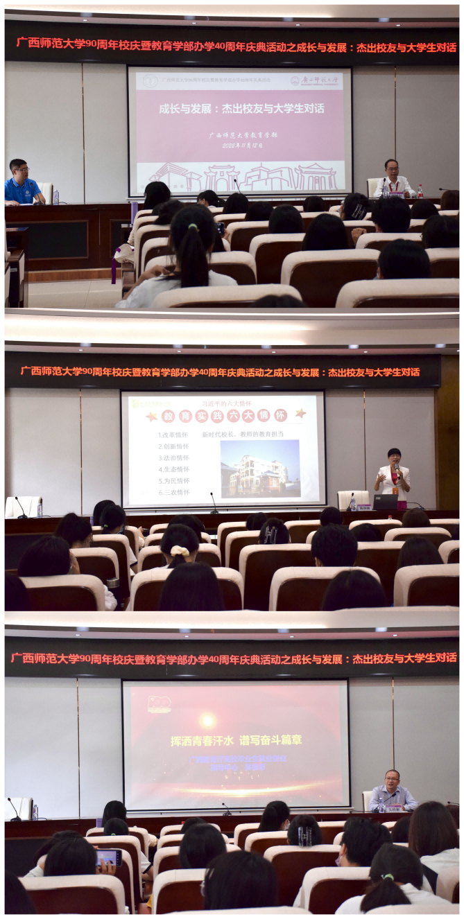 独秀九秩,盛世筑梦。为凝聚学部师生校友力量,提升学部学生的专业素养,引导学生把握专业实践前沿方向,11月12日,教育学部借助校友返校参加校庆活动的契机,在起文楼第五会议室举行优秀校友交流会,来宾市高级中学党委书记、校长、学部99级硕士生陆铭中校友,广西教学名师、北流市实验幼儿园园长、学部2013级硕士研究生陈韵湖校友和自治区教育厅高校毕业生就业创业指导中心副研究员、“全国脱贫攻坚先进个人”获得者、学部2005级硕士研究生吴桂彬校友担任嘉宾。小学教育和学前教育部分本科生和研究生参加了本次交流会。