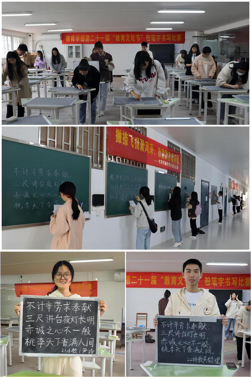仪式结束后,教育文化节子活动“粉笔字书写比赛”在文三区教师教育实验中心紧锣密鼓地开展,本科各班级学生有序进行粉笔字板书,展示师范生技能。