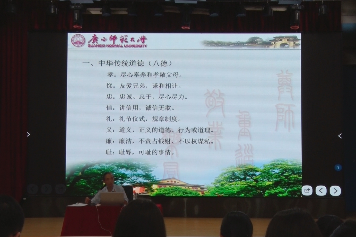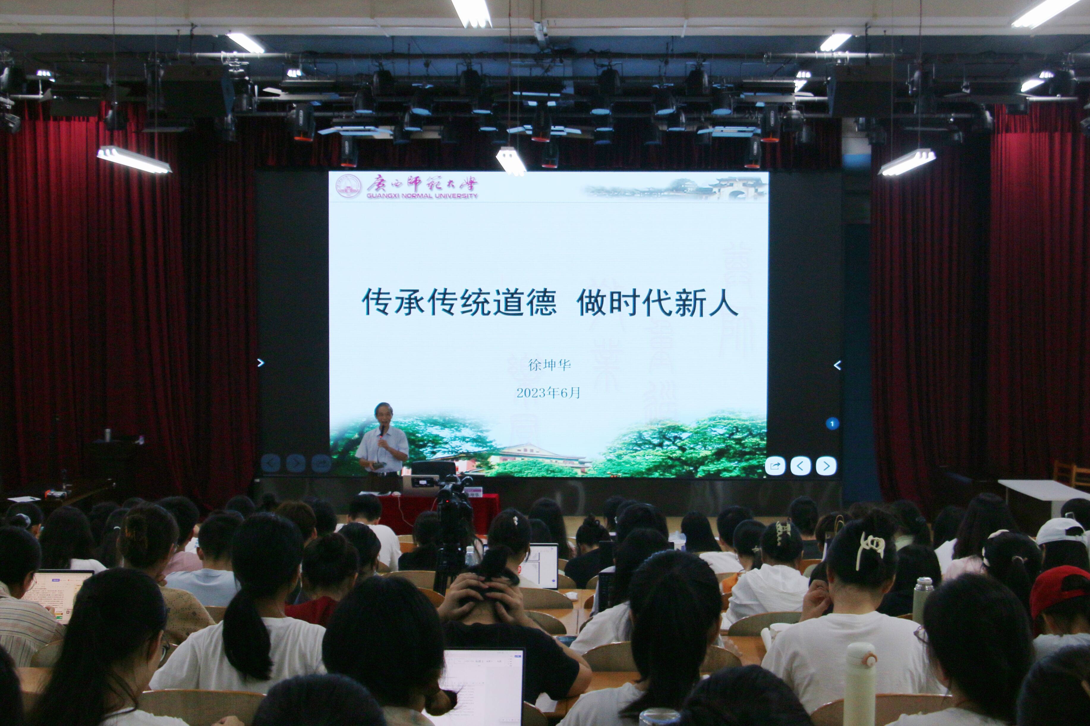 为学习贯彻党的二十大报告精神,践行社会主义核心价值观,弘扬习近平新时代中国特色社会主义思想学习风尚,6月20日晚,文学院/新闻与传播学院在文二119教室举行“传承传统‘八德’,做时代新人”道德讲堂系列讲座。本次讲座由学院团委书记主持,校关工委副主任、广西师范大学纪委原副书记徐坤华主讲,第五期青马班全体成员、2022级汉语言文学专业部分学生参加讲座。