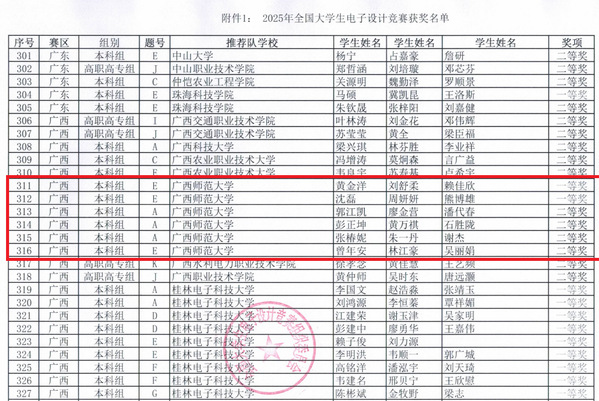 在后续赛程中,学生团队历经紧张激烈的校内选拔、7月30日至8月2日为期四天三夜的封闭式现场制作、广西赛区评审等诸多环节,最终7支队伍被推荐参与国家级奖项角逐。8月10日,我校队伍顺利完成推荐国家奖封闭式综合测评;8月20日至22日,又赴大连理工大学参加了全国一等奖候选队伍复测评审。经过国家组委会专家的多轮评审与现场答辩,我校学子最终脱颖而出,取得优异成绩,全面展现了我校学生扎实的专业基础、出色的创新能力和良好的团队协作精神。