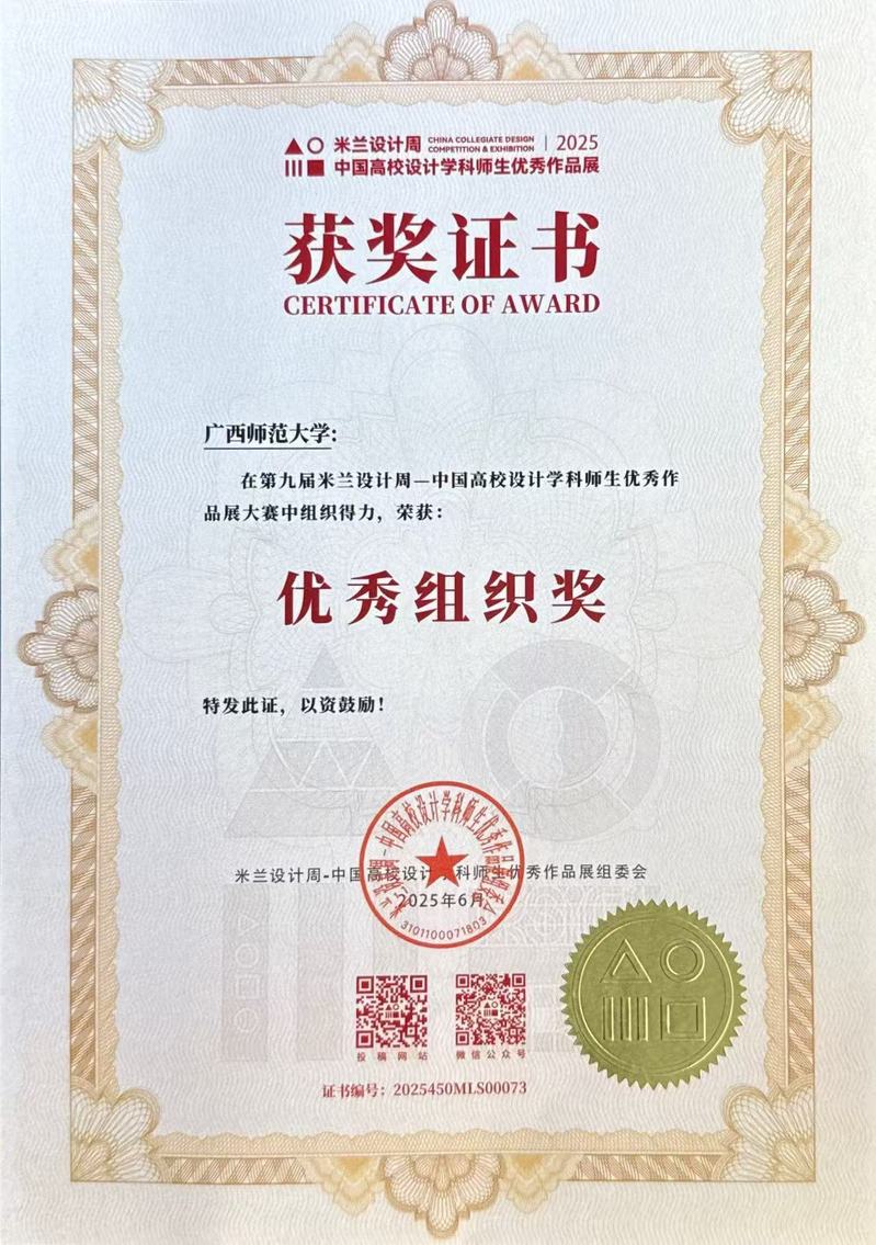 设计学院师生凭借卓越的创意与扎实的专业能力脱颖而出,共斩获112项奖项,其中国赛一等奖 1 项、二等奖 6 项、三等奖 13 项;广西分区赛一等奖 15 项、二等奖 46 项、三等奖 31 项,广西师范大学荣获“优秀组织奖”,充分彰显了我院设计学科的综合实力与人才培养成效。