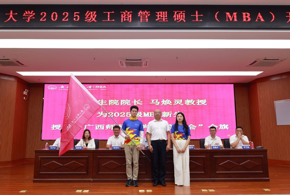 校研究生院主要负责人长为2025级MBA联合会主席、秘书长授予“广西师范大学MBA联合会”会旗,标志着新一届MBA学子正式接过了前辈们的接力棒,肩负起追求卓越、团结奋进,服务学校与社会的光荣使命。典礼在全场齐唱校歌《育才之歌》的悠扬旋律中落下帷幕