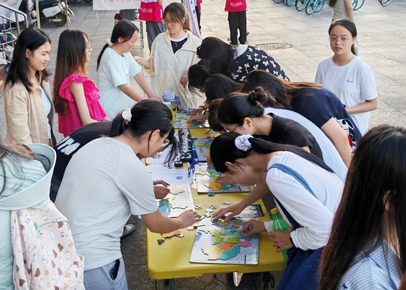 活动现场分设三个主题区域,每个区域都各具特色。地理知识答题区内,同学们回答着从季风气候分布到板块构造学说等一系列专业题目。一道道设计精巧的问题不仅考验着参与者的知识储备,更引发了对地理现象的深入思考;中国地图拼图区充满了团队协作的氛围。同学们通过将山川湖海“归位”,在拼接省区的过程中加深了对中国地理格局的认知;奖品兑换区为成功完成挑战的同学提供了限定印章明信片、透明雨伞和纸巾等实用礼品,让参与者在收获知识的同时也获得了的实物奖励。其中有印章辉锑矿、恐龙蛋、紫水晶等纹样,让知识变得更加可触可感。
