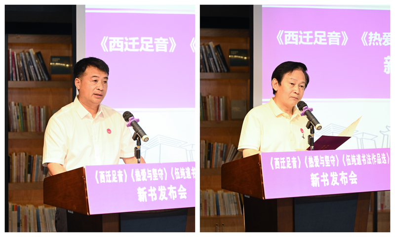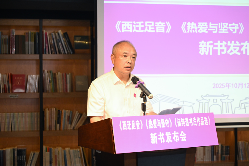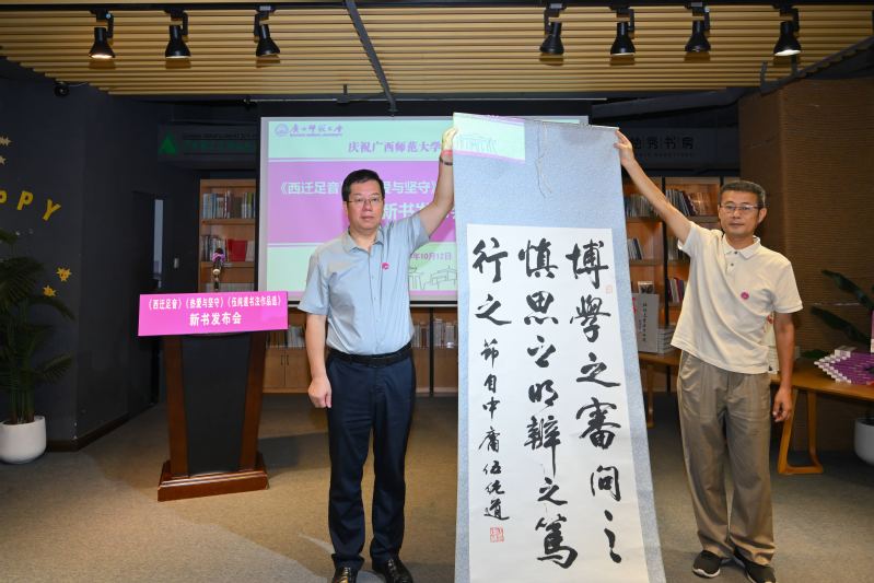 10月12日上午,在校庆日当天,《西迁足音——国立桂林师范学院西迁办学口述史》《热爱与坚守——广西师范大学校友访谈录·基础教育篇》《大道坦然——伍纯道书法作品选》新书发布会在广西师范大学育才校区独秀书房举行,一同为学校93周年校庆献礼。校党委书记贺祖斌,我校原党委副书记、《西迁足音》主编赵铁,校党委常委、组织部部长谭智雄,校党委常委、统战部部长毛立刚,我校伍纯道书法艺术研究所所长、《伍纯道书法作品选》副主编唐长兴,伍纯道教授的儿子伍靖武,历史文化与旅游学院1988级校友、百色高中特级教师、《热爱与坚守》一书受访者代表黄华语出席新书发布会。发布会由校党委常委、副校长黄晓昀主持。