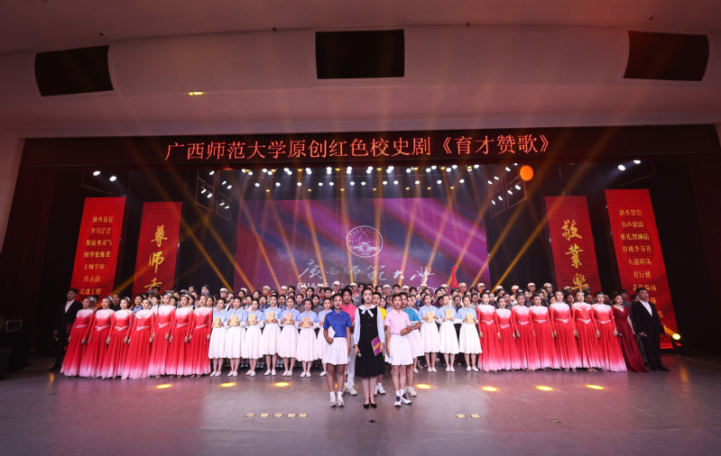 《育才赞歌》以舞蹈、歌剧、诗歌朗诵等多元化艺术表现形式,再现了广西师范大学红色校史中的诸多重要历史人物与事件。在《播撒火种》篇章,观众看到首任校长杨东莼与学生围绕马克思主义信仰展开思想对话的场景,了解到学校创办初期进步思想传播的历史;《铭记湘江》篇章通过师生照顾红军战士的情节,刻画师大人的善良与担当;《传播真理》篇章里,陈望道等先辈创办月牙报刊、播撒信仰种子的桥段,让八桂大地上的红色办学记忆愈发鲜活。《筚路蓝缕》篇章讲述了学校在抗战背景下迁校、坚持办学,师生投身革命与教育事业的故事。最后的《盛世筑梦》篇章全景式展现了学校在新时代的发展成就与师大人的精神风貌。展演尾声,全场起立齐唱校歌《育才之歌》,现场氛围达到高潮。