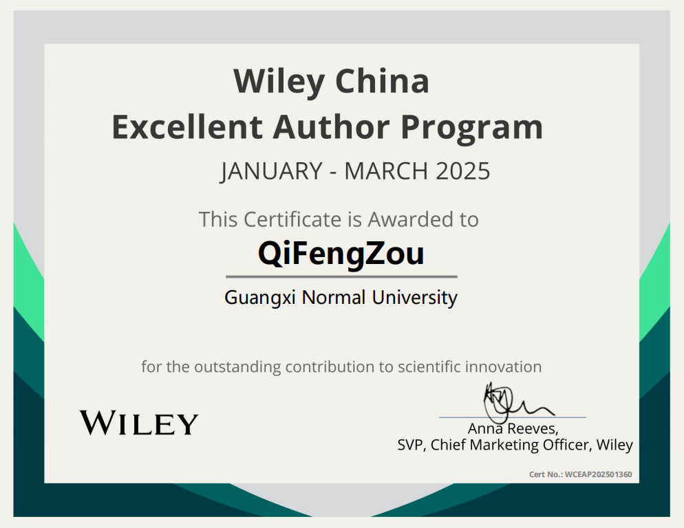 近日,广西师范大学化学与药学学院2022级化学(独秀试验班)专业本科生邹祺枫同学获得Wiley中国开放科学高贡献作者奖。