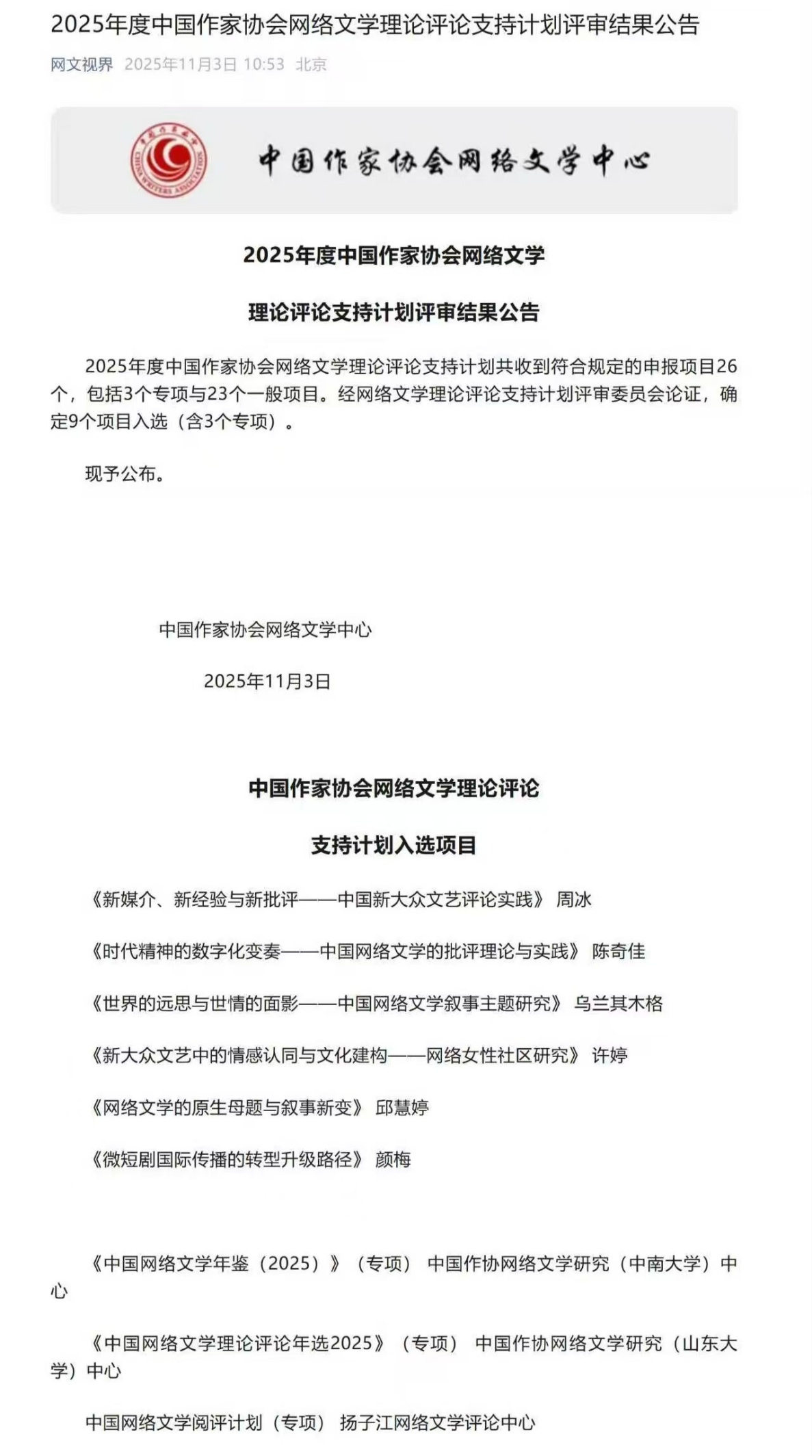 11月3日,2025年度中国作家协会网络文学理论评论支持计划评审结果公布。其中,我校文学院/新闻与传播学院邱慧婷副教授的项目《网络文学的原生母题与叙事新变》成功入选。