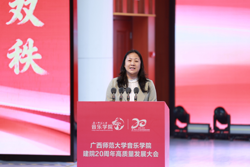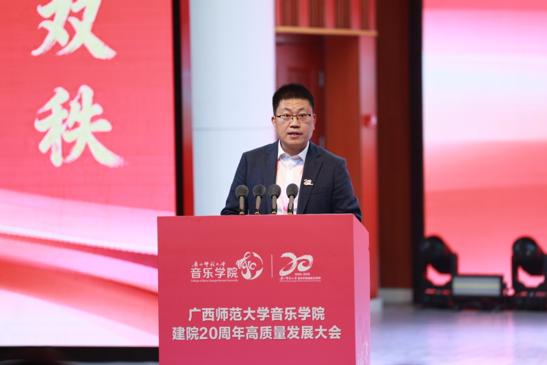 11月15日,广西师范大学音乐学院建院20周年高质量发展大会在雁山校区音乐楼三楼综合厅举行。广西师范大学党委常委、副校长、校友会常务副会长黄晓昀,党委常委、统战部部长、机关党委书记毛立刚出席大会。河南师范大学音乐舞蹈学院、杭州师范大学音乐学院负责人,校外专家学者、行业代表、院友代表,学校相关职能部门及各学院(部)负责人,音乐学院历任领导、全体教职员工、离退休教师及学生代表近500人参会。音乐学院党委主要负责人主持会议。