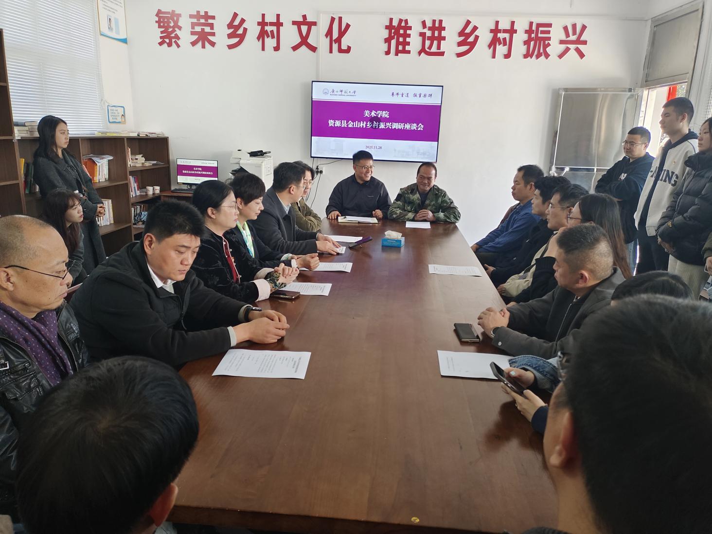 活动伊始,美术学院党委一行与金山村“两委”干部、驻村工作队召开专题座谈会。资源县副县长、金山村党支部书记围绕资源县及行政村基本概况、发展瓶颈制约等方面作了详细介绍。驻村第一书记重点分享了近年来金山村在乡村振兴实践中取得的阶段性成效,表示针对美术学院作为新对接后盾单位的职能定位,特别希望借助美术学院专业优势,在乡村风貌提质、文化氛围营造、美育普及推广等领域注入艺术动能,为金山村实现跨越式振兴提供支撑。