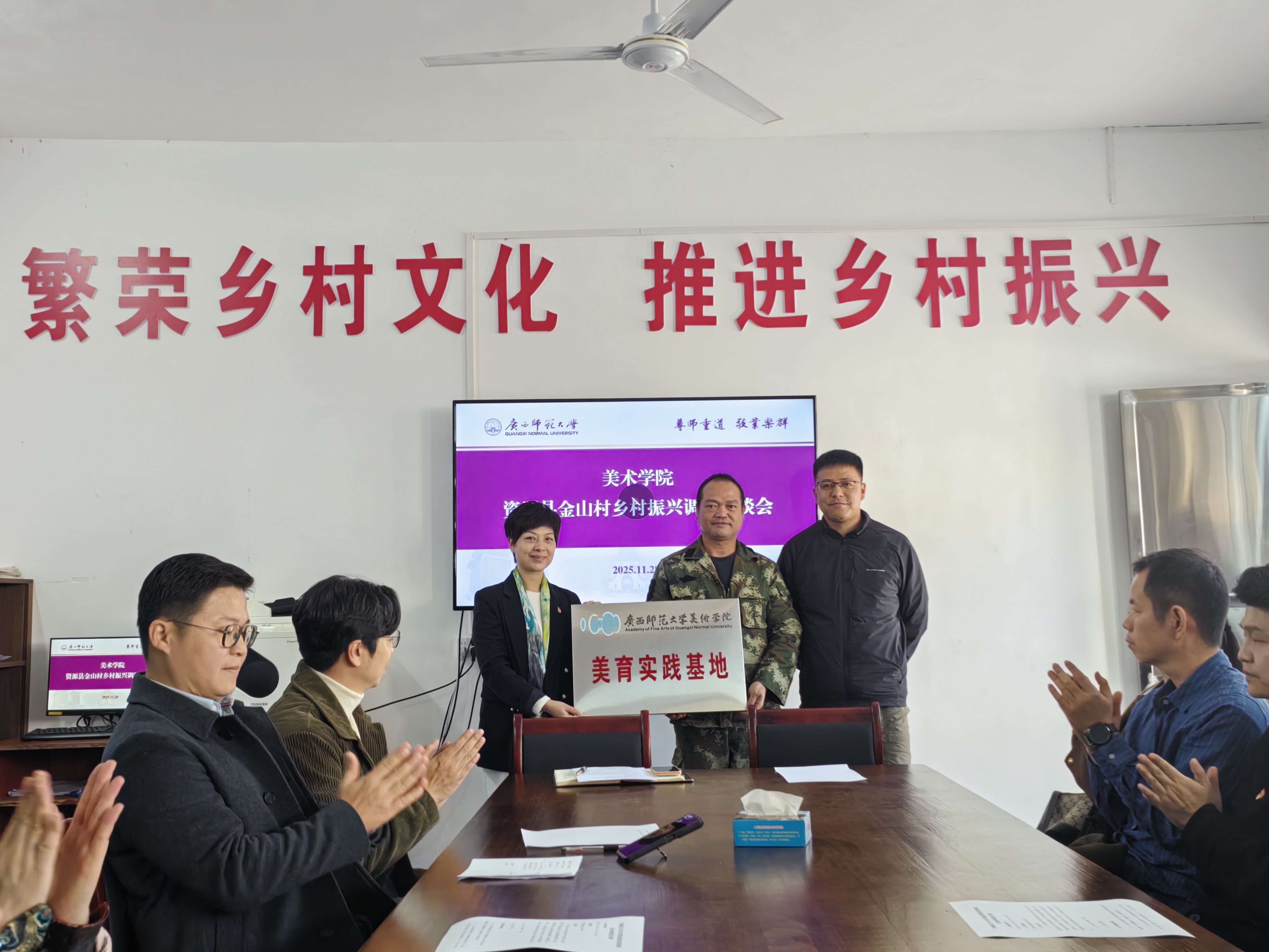 为构建校地长效帮扶机制,推动优质艺术资源精准下沉乡村一线,活动当天同步举行“广西师范大学美术学院美育实践基地”挂牌仪式。该基地的设立,旨在将金山村打造为美术学院师生深入基层服务社会、开展艺术创作、推广美育工作的核心阵地。未来,美术学院将以基地为纽带,常态化组织师生开展墙绘创作、美育支教等实践活动,以艺术笔触打造乡村风貌,以文化浸润涵养文明乡风,切实将党建政治优势、组织优势转化为乡村振兴发展效能。