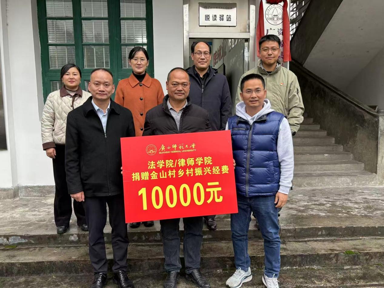 随后,在广西师范大学党委常委、组织部部长谭智雄,资源县人民政府副县长张振岩,以及中峰镇、金山村相关负责人的共同见证下,法学院作为后盾单位,现场举行乡村振兴经费捐赠仪式,所捐经费将用于支持金山村特色产业发展和乡村振兴各项工作。