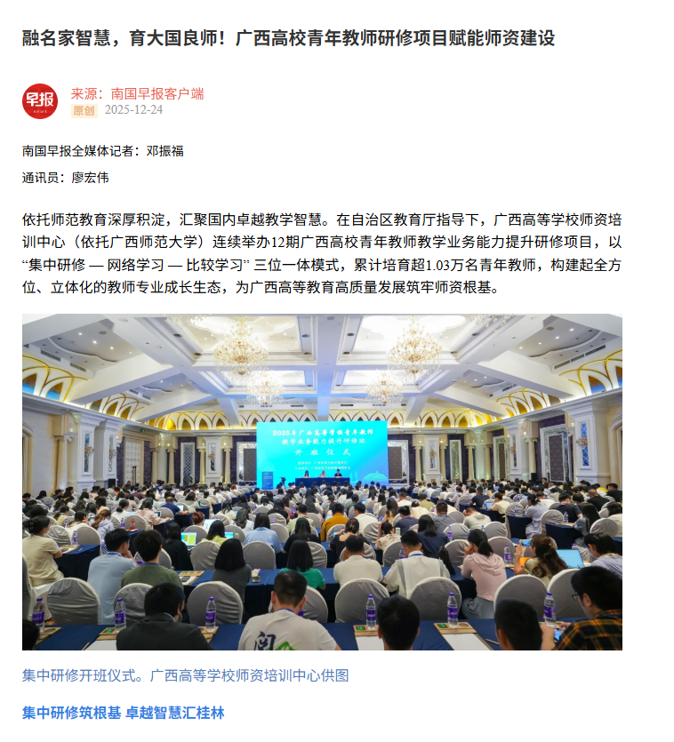 12月24日,【南方早报】关注报道依托我校的广西高等学校师资培训中心,在自治区教育厅指导下持续开展高校青年教师教学业务能力提升研修项目,至今已举办12期,累计培养超1.03万名教师。项目构集中研修—网络学习—比较学习“三位一体模式,通过汇聚国内高校名家专家进行专题授课,组织学员赴武汉大学、浙江大学、北京师范大学等多所名校开展沉浸式学习,并结合线上平台延伸学习时效,系统助力青年教师提升师德素养、教学技能与数字化应用能力。中心坚持以”融名家智慧,育大国良师“为使命,着力推动教师专业成长与教学创新,为广西高等教育高质量发展奠定坚实师资基础。