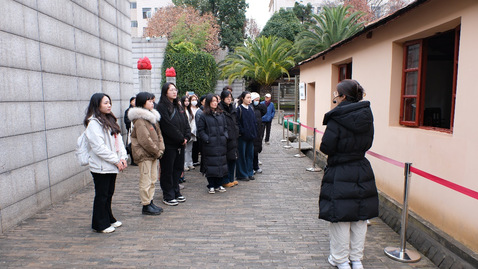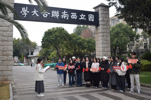 当天上午,学生团队抵达国立西南联大旧址,“望道微课”理论宣讲团成员田米以《守望不息:烽火岁月中的西南联大》为题,讲述1937年清华、北大、南开师生辗转迁昆办学的历史。成员们瞻仰三校校长石雕像与西南联大纪念碑,参观原教室及博物馆,深切感悟联大学子教育报国情怀与爱国民主运动历史脉络。
