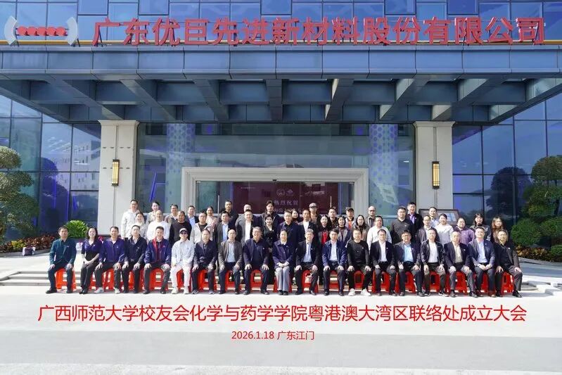 2026年1月18日,广西师范大学校友会化学与药学学院粤港澳大湾区联络处成立大会在广东江门市广东优巨先进新材料股份有限公司举行。学校党委常委、副校长、校友会常务副会长黄晓昀出席并致辞。学校校友工作办公室/教育发展基金会管理办公室、化学与药学学院相关负责人,粤港澳大湾区校友会、校企业家校友联谊会、粤港澳大湾区校友企业家联盟理事会代表,以及来自东莞、佛山、肇庆、清远、惠州、珠海、江门、广州、深圳等地校友会和南宁联络处的代表,化学与药学学院师生、校友代表等近60人参加活动。