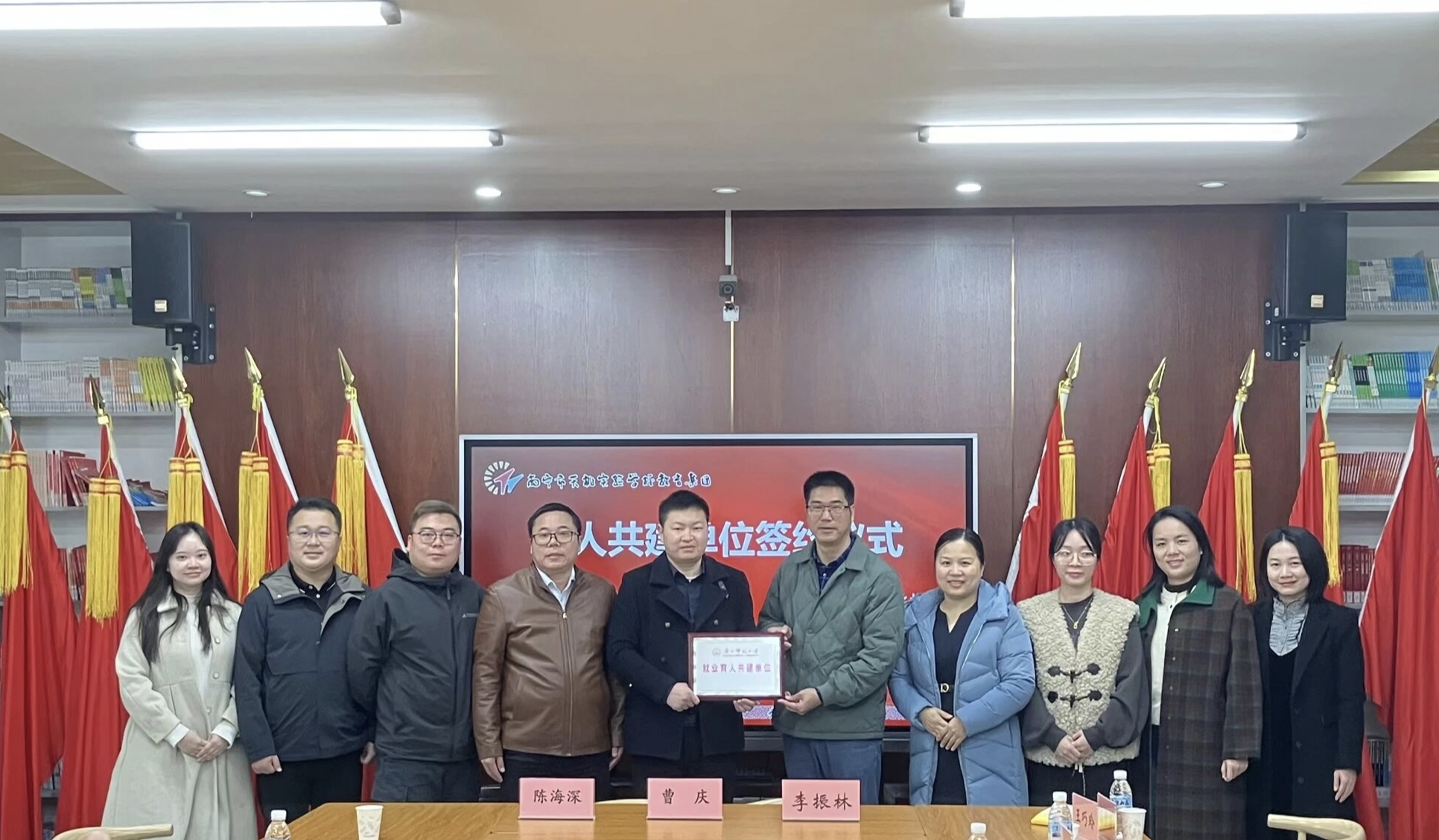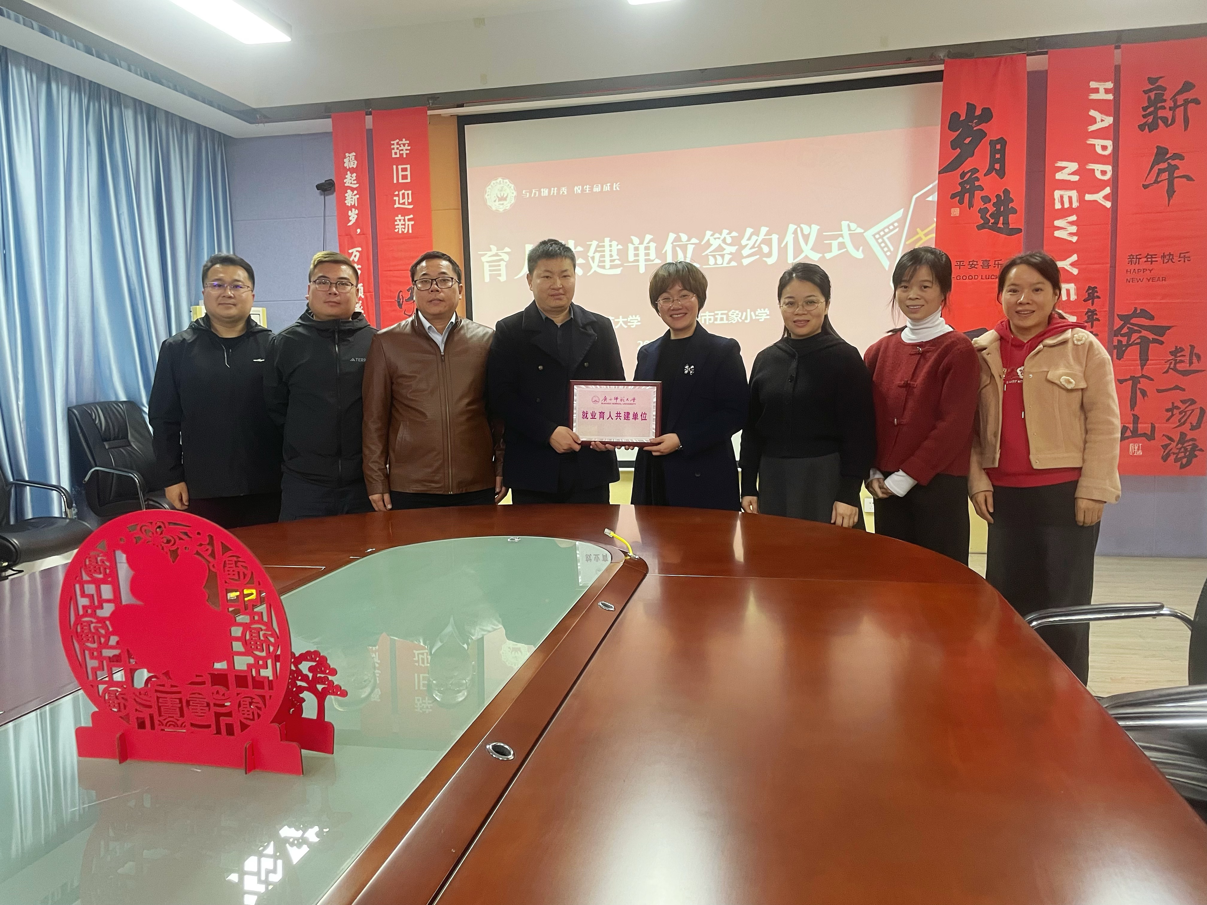 在各学校师生代表的共同见证下,学院相关负责人分别授予南宁市天桃实验学校、滨湖路小学、中山路小学、滨湖路小学五象校区、大学路小学、南宁市五象集团学校“就业育人共建基地”牌匾,标志着学院与南宁基础教育领域优质学校的合作正式落地,为学院的师范专业毕业生开辟了稳定的就业渠道与实践平台,也为学院精准优化师范专业培养人才方案提供了来自一线教学的真实需求反馈。