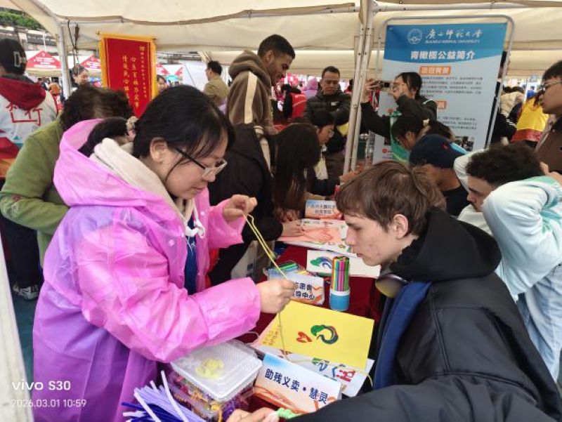 2026年3月1日上午,在第63个“学雷锋纪念日”、第6个“广西志愿者日”及“广西志愿服务月”到来之际,自治区党委社会工作部、自治区文明办、桂林市委等单位在桂林市七星区空明西路党建文化广场联合举办了2026年广西志愿服务月启动仪式暨“学雷锋·文明实践我行动”集中展示交流活动。来自14地市的社会工作部、社会工作机构、志愿组织、爱心企业、基层社区、高校志愿团体代表等30多家单位、400多人参加。由校团委指导的乐群志愿者行动指导中心组织多名中外青年志愿者以多种方式助力活动的举办。