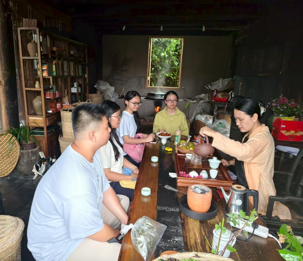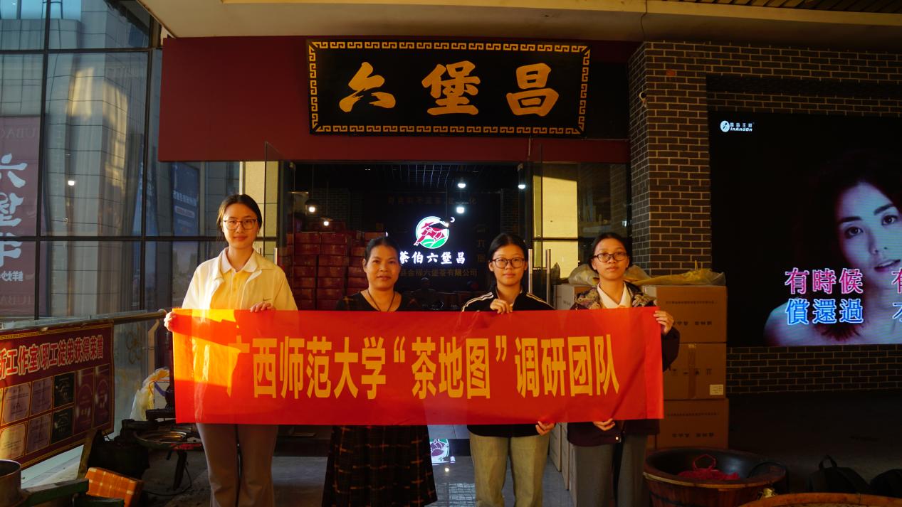 在当地的茶企和茶社,团队成员与非遗传承人何素琴老师深入交流。何师傅现场演示了工艺对茶品风格的深刻影响:同样茶底,传统工艺制成的“古韵茶”带有独特的涩底与韵味,而通过创新工艺低温冲泡萃取的“冰糖甜”,则呈现出清甜爽口的现代风味。何师傅也严谨指出,工艺创新需基于优质茶青,并非一概而论。这种对品质的坚守与对工艺的探索,让队员们看到了六堡茶产业既传承古法又面向市场的活力。标准化、规模化的种植与加工,确保了原料稳定与品质提升,而龙头企业的带动,则将分散的农户纳入现代产业体系,共享发展红利。