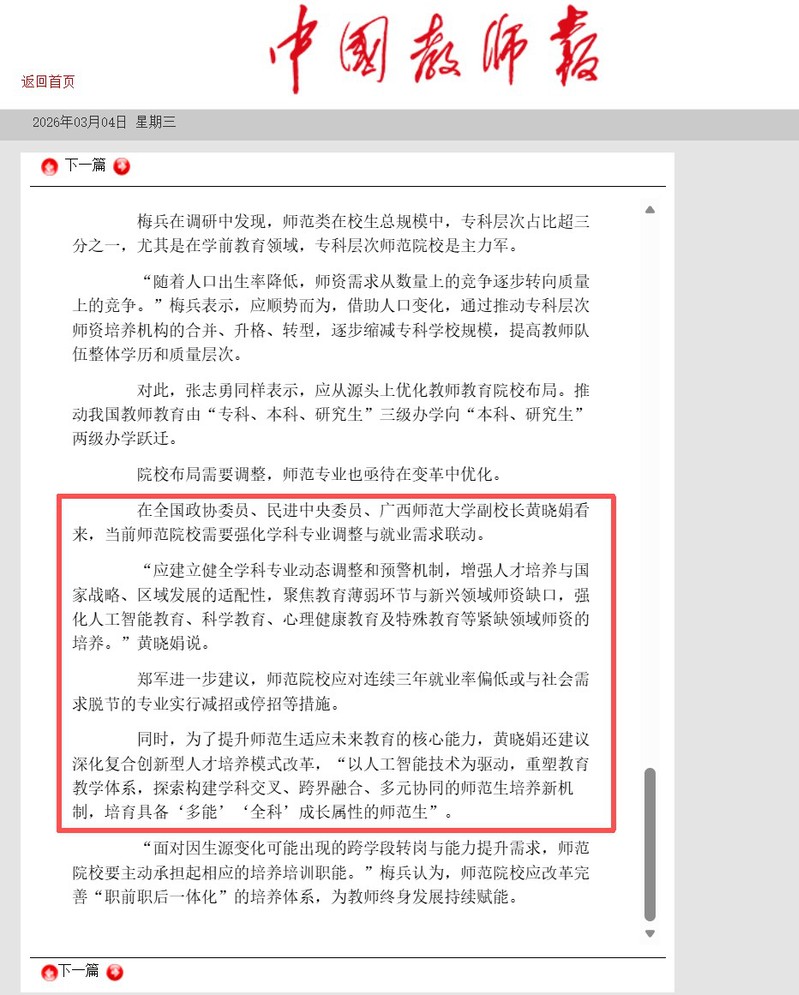 3月4日,《中国教师报》关注报道全国政协委员、民进中央委员、我校副校长黄晓娟就人口变局下教师资源配置与师范教育发展建言献策。她指出,面对学龄人口波动带来的师资供需新变化,师范院校需强化学科专业调整与就业需求联动。