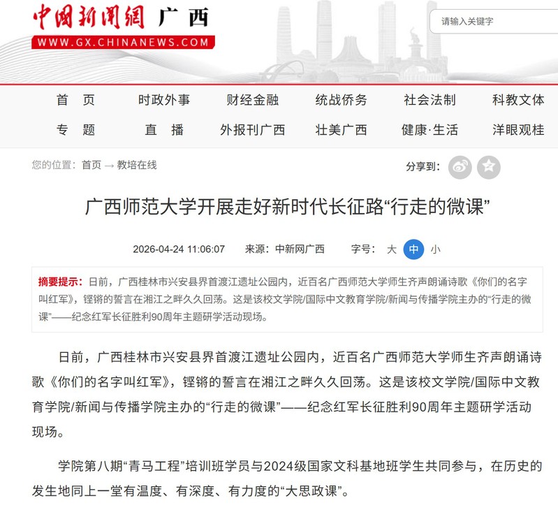 4月24日,【中国新闻网】关注报道我校“行走的微课”纪念红军长征胜利90周年主题研学活动。我校近百名师生走进兴安县界首渡江遗址公园、红军长征湘江战役纪念馆等地,在湘江之畔重温红色记忆,同上了一堂有温度、有深度、有力度的“大思政课”。本次活动聚焦长征精神与铸牢中华民族共同体意识主线,将思政小课堂与社会大课堂深度融合,是推动中文拔尖人才培养从“课堂讲授”向“实践体悟”转型的生动实践。