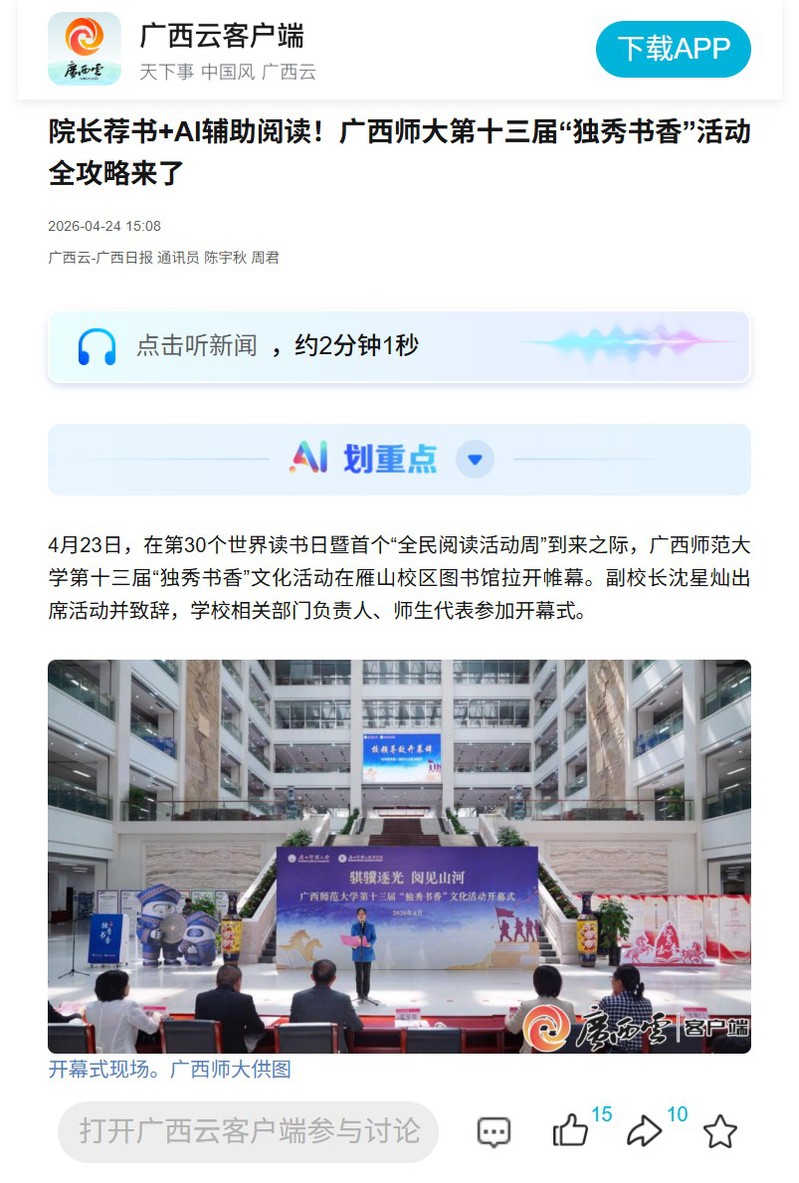 4月24日,【广西云】关注报道我校第十三届“独秀书香”活动启动。今年活动以“骐骥逐光,阅见山河”为主题,推出“师者领航·院长荐书”板块,特别设置了“智读未来:AI馆员体验日”“青春Vlog寻书”等环节,通过“读、行、写、讲、拍”五位一体模式,持续擦亮校园文化品牌。